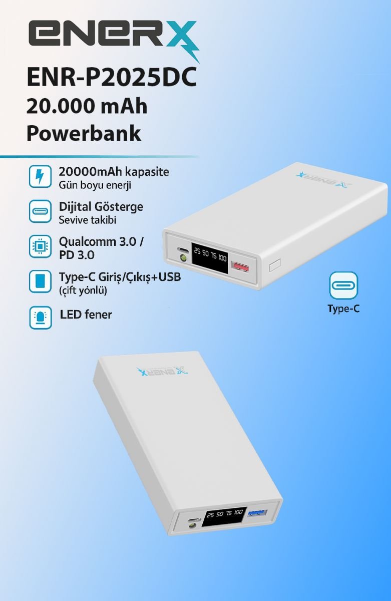 Enerx ENR-P2025DC 20000 Mah Powerbank Hızlı Şarj, LED Göstergeli, 2.1A Çift Çıkış Beyaz
